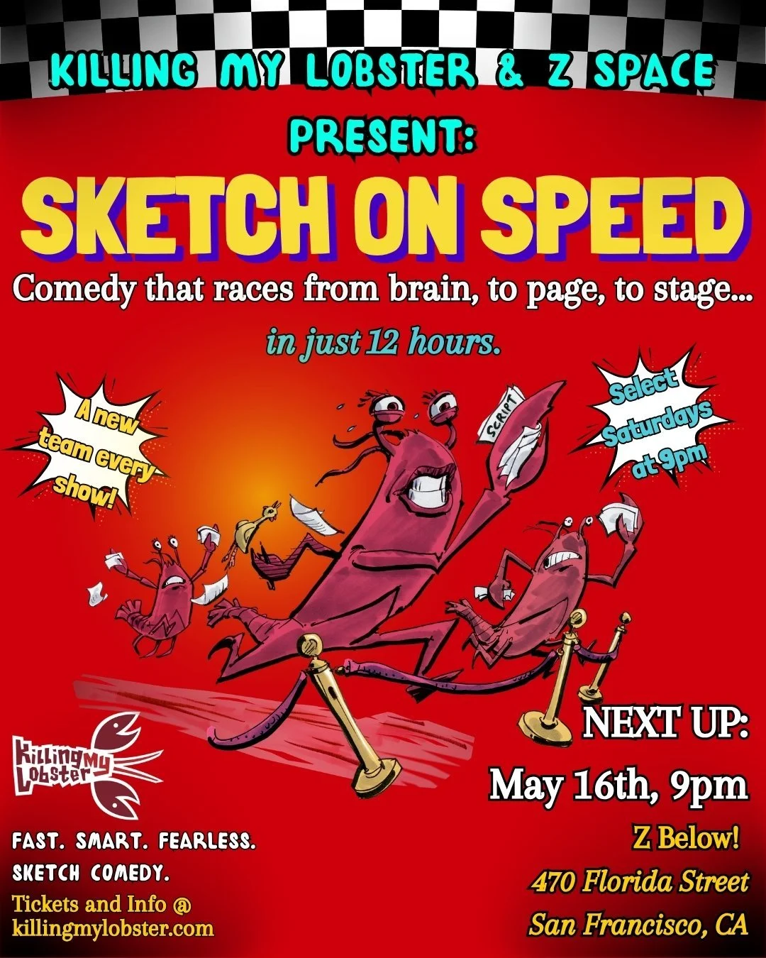 In today's fast-paced world, immediate gratification is all the rage--and sketch comedy troupe Killing My Lobster is here to provide! Over the course of twelve hours, we are forcing our writers and actors to produce an entire show--potentially blending sketch comedy, improv, crowd work, or maybe even pranks on our performers?? We can't know for sure, but no matter what, before that timer is up, it will be performed for a live audience. Join Killing My Lobster as we race toward the finish line and bring you raw, uncut, boundary-pushing sketch comedy that asks the question: "Did you even read to the end of this blurb?"